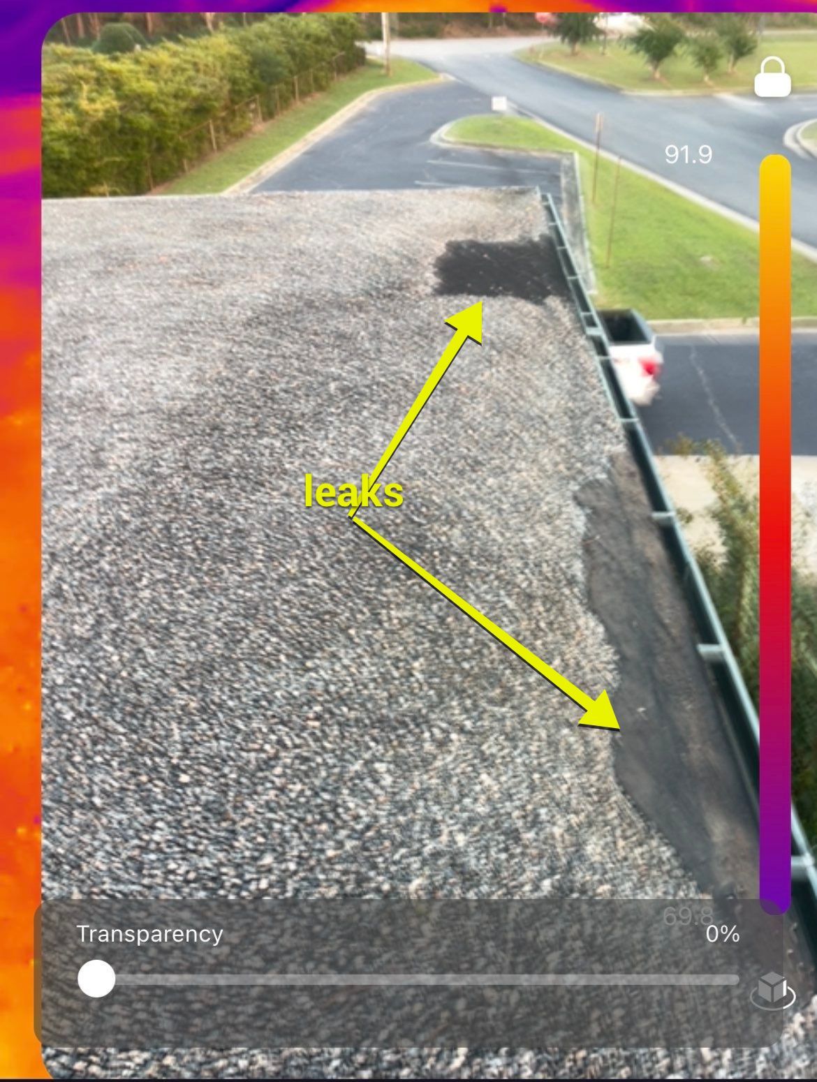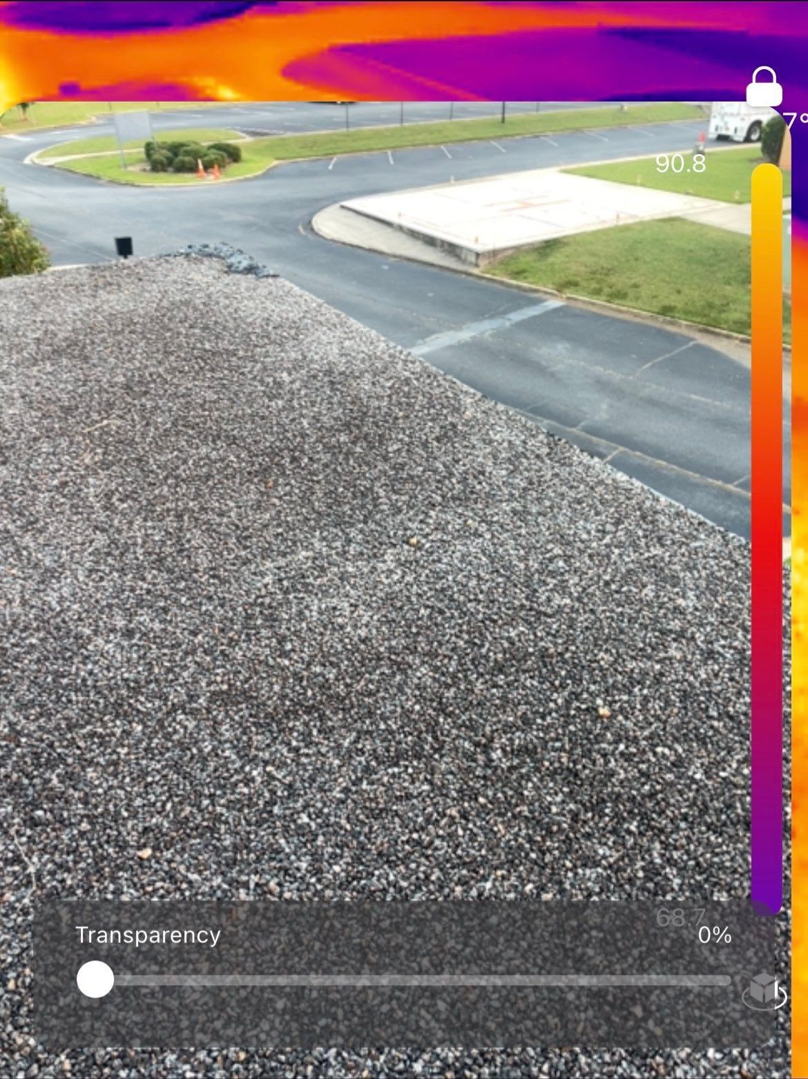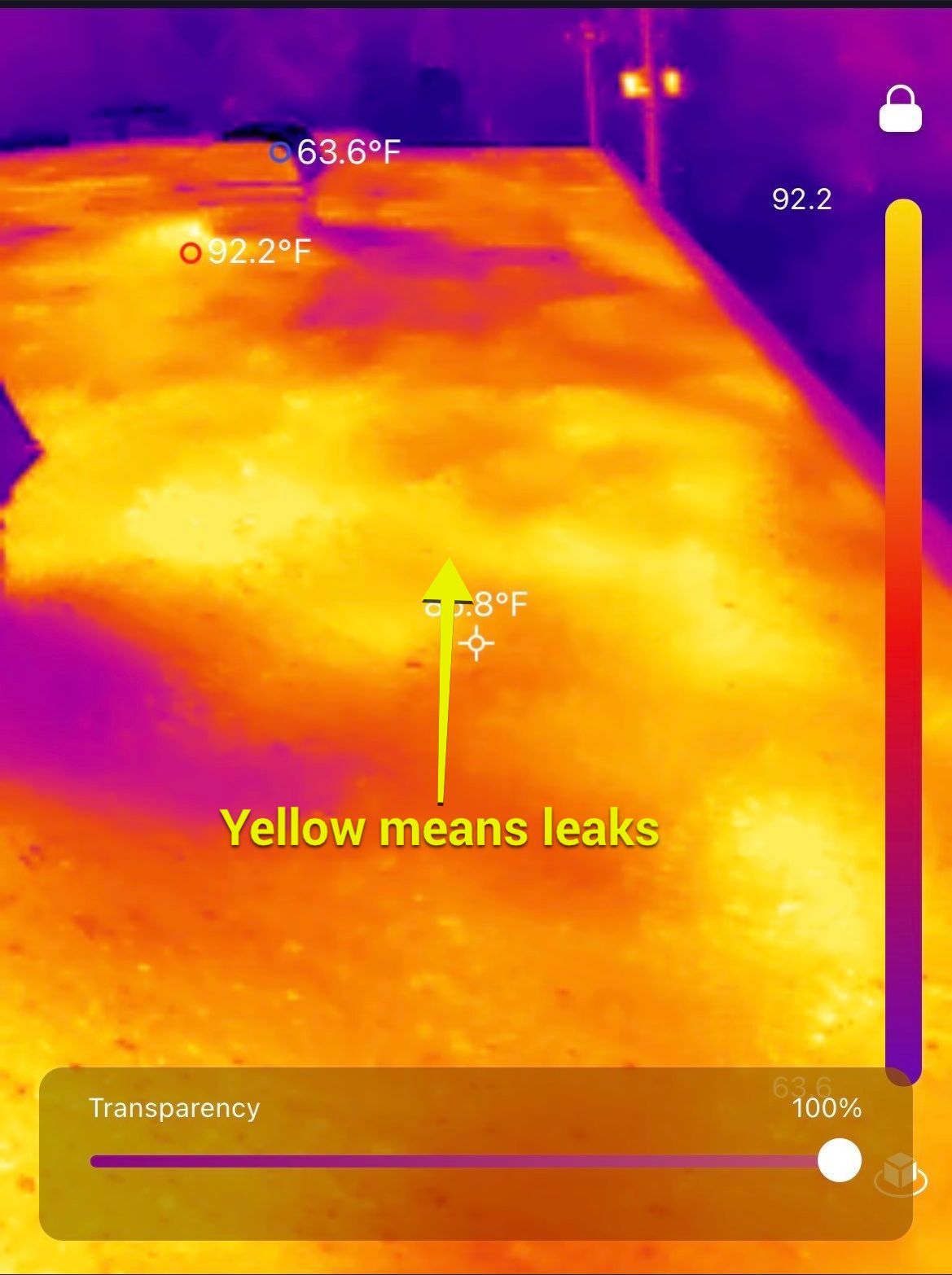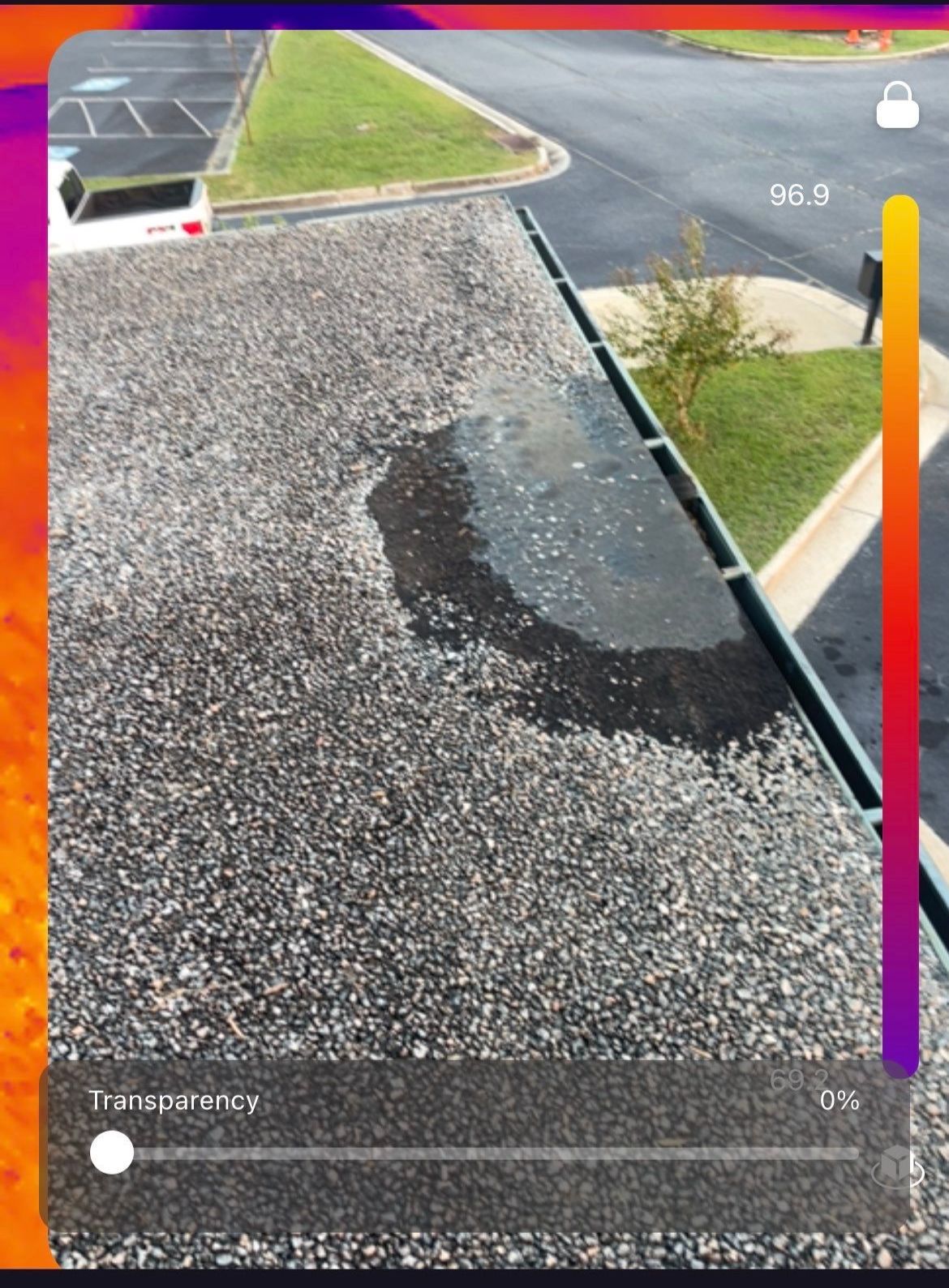 We used a thermal heat detection system to scan the roof surface. This method shows temperature differences across the roof and helps locate areas where water may have been absorbed into the insulated board beneath the top roofing materials. Because wet insulation warms differently from dry areas, the thermal images reveal those wet spots visually.