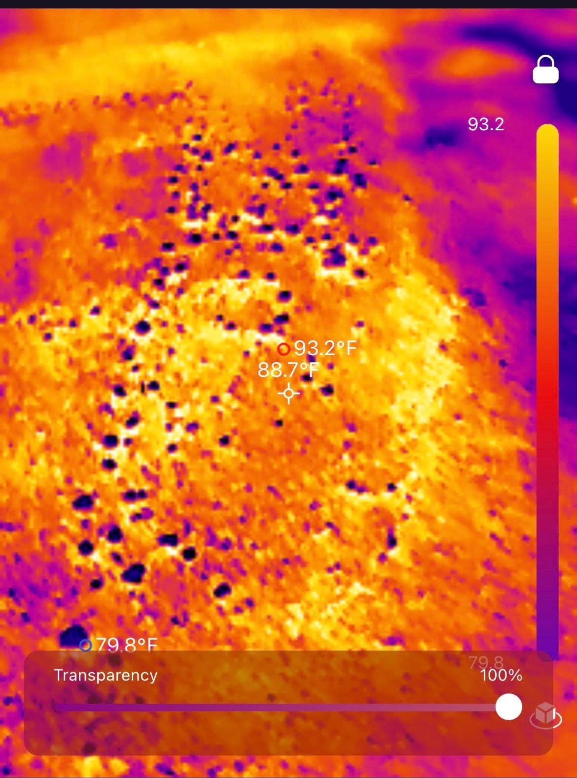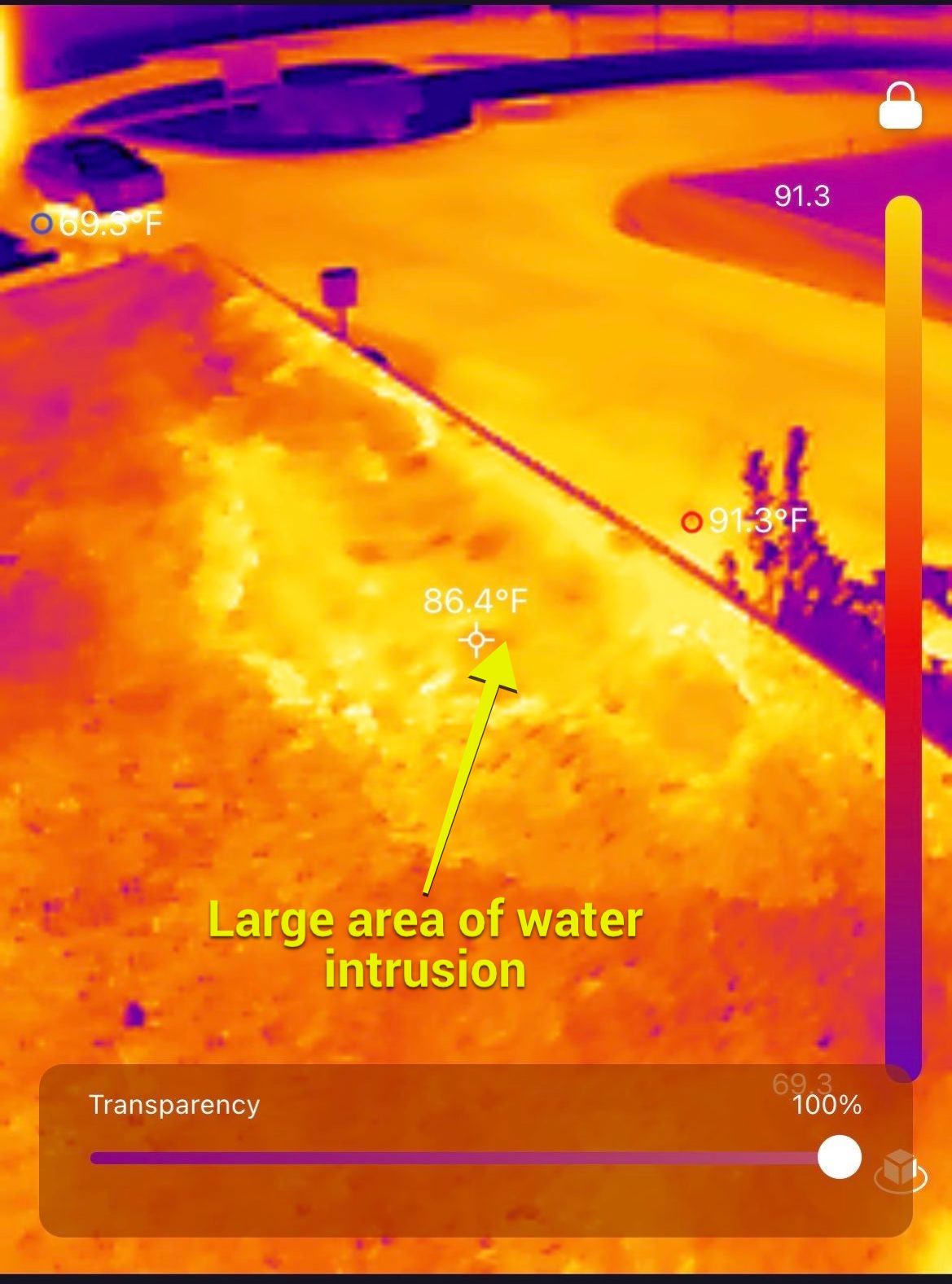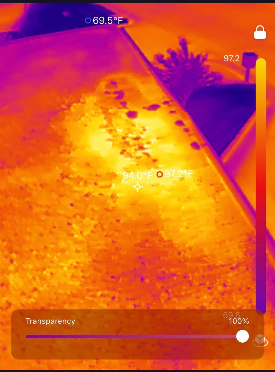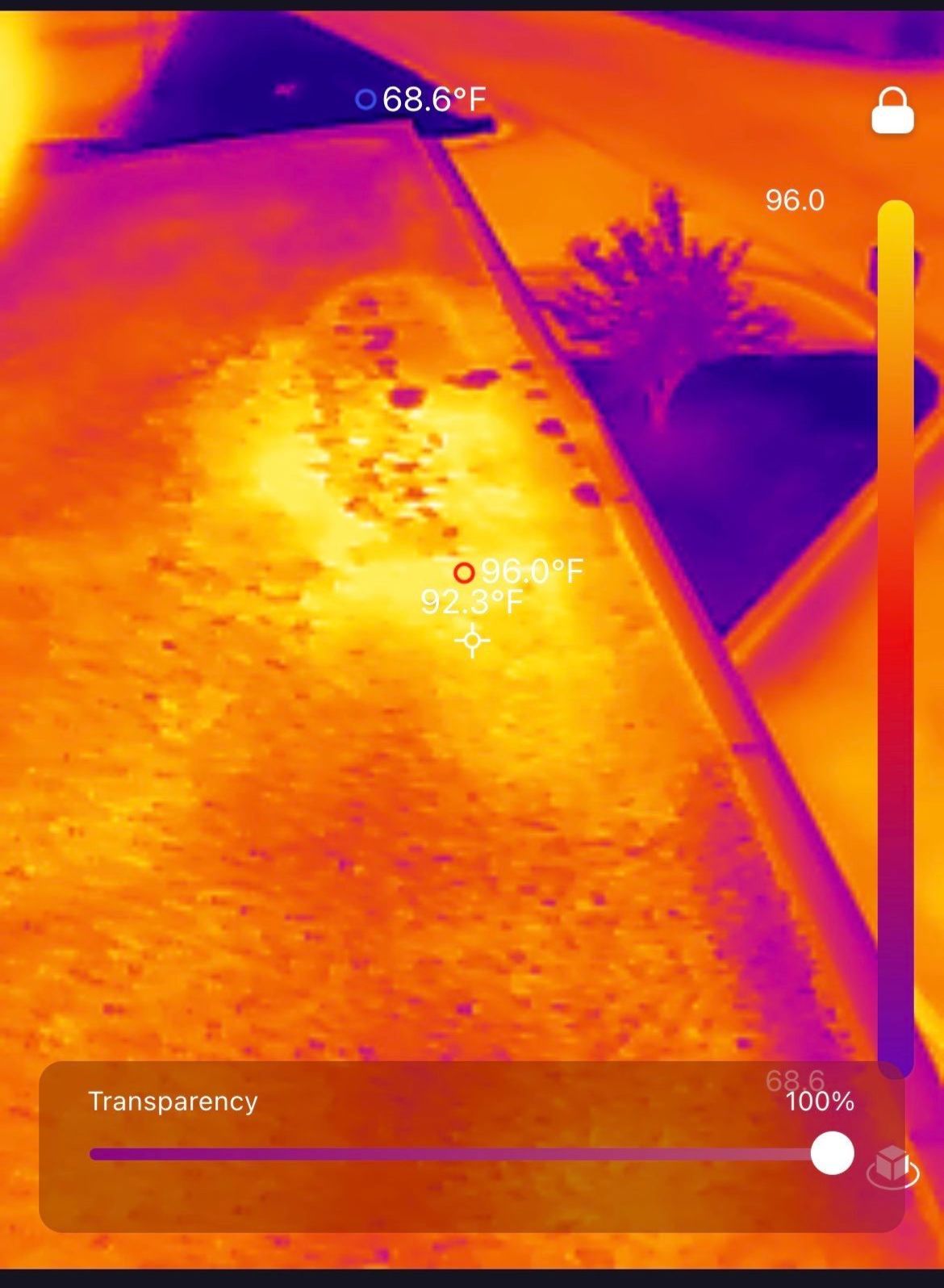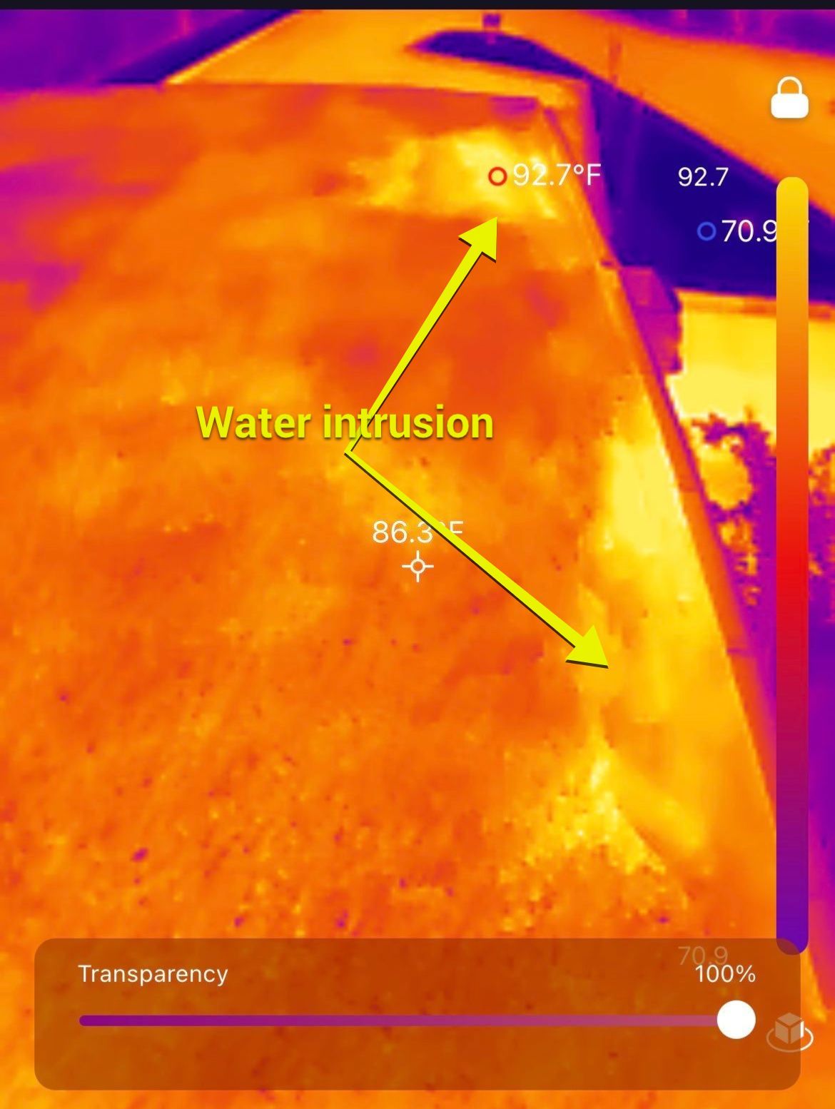 We used a thermal heat detection system to scan the roof surface. This method shows temperature differences across the roof and helps locate areas where water may have been absorbed into the insulated board beneath the top roofing materials. Because wet insulation warms differently from dry areas, the thermal images reveal those wet spots visually.